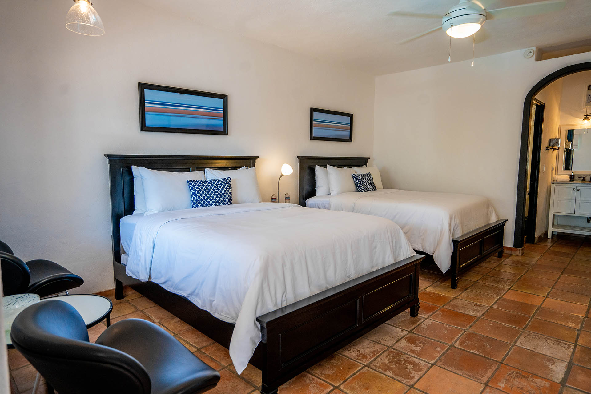 First-level rooms overlooking courtyard and pool along with views of La Playita and Puerto Los Cabos Marina, feature 2 queen beds, flat-screen television, free WiFi, and air conditioning. Book with us and breakfast is included.